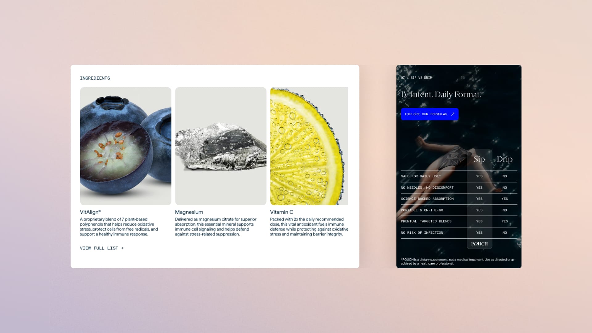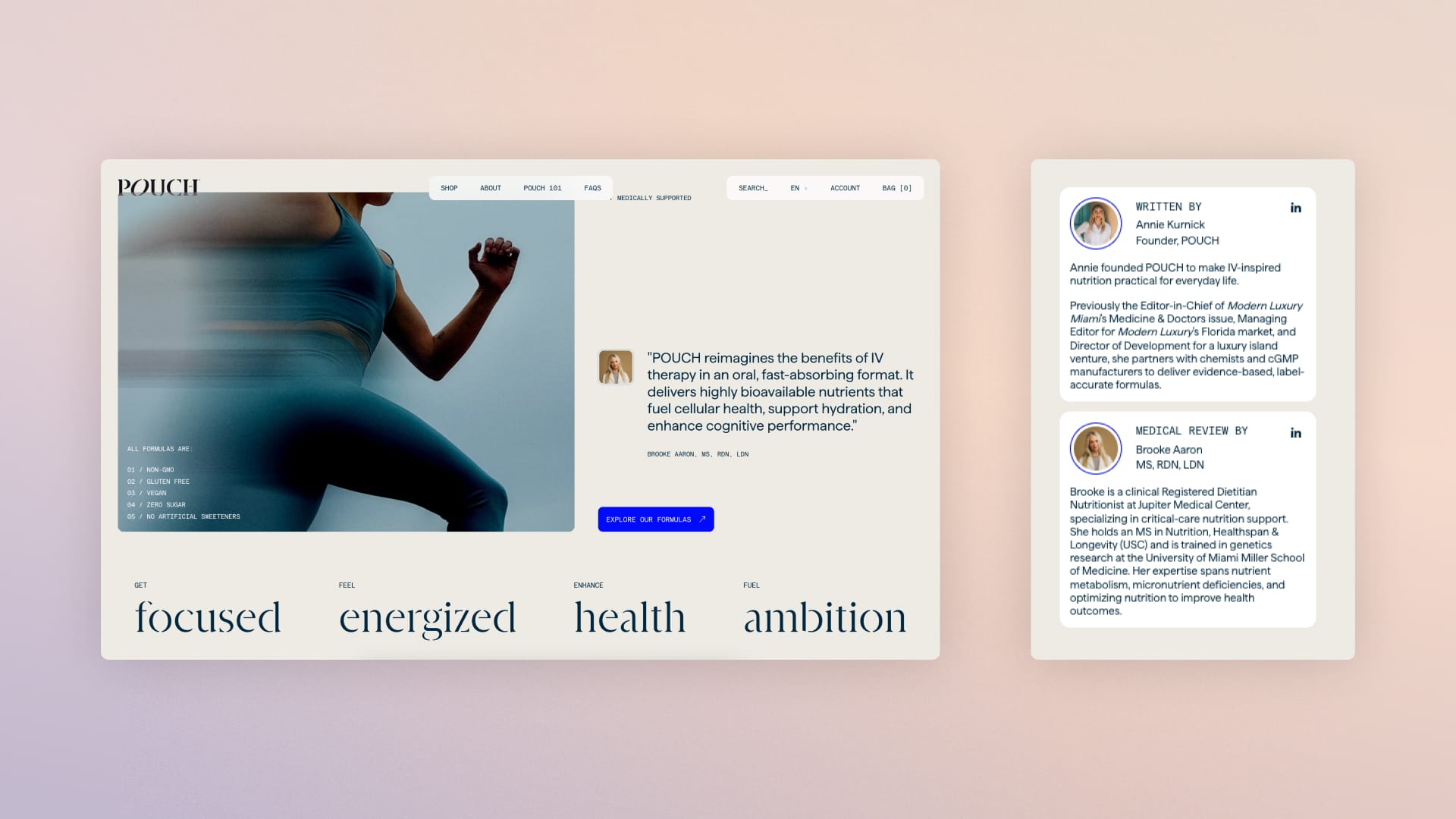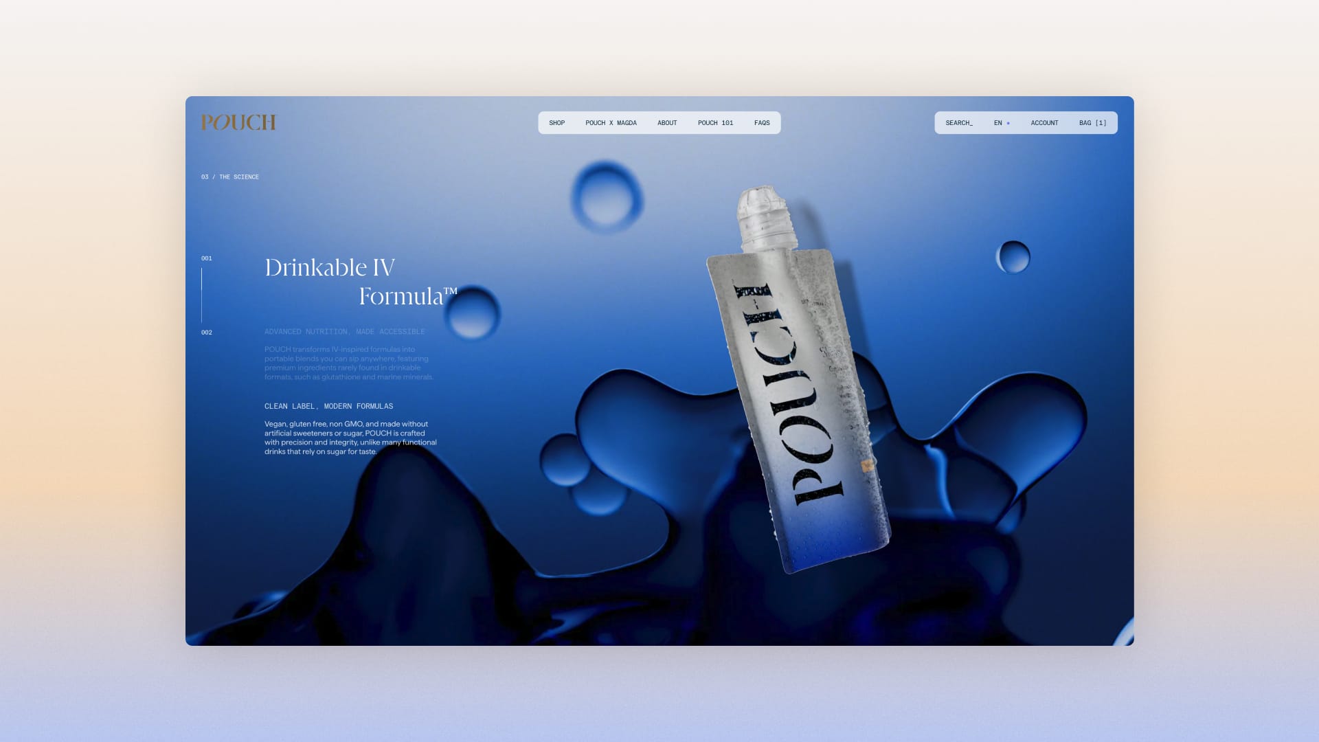 Par le choix des typographies, des flous, des couleurs froides et énergiques, des micro-interactions subtiles, Pouch révèle avec cohérence son positionnement entre médecine et lifestyle premium, à la fois inspirant et rassurant.