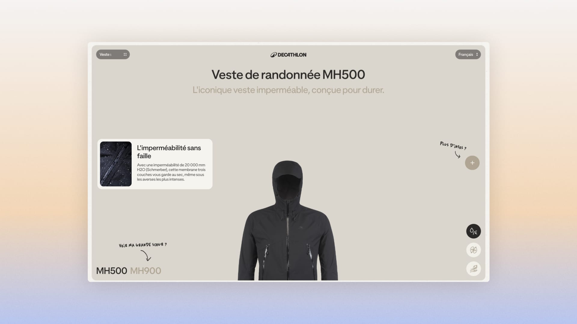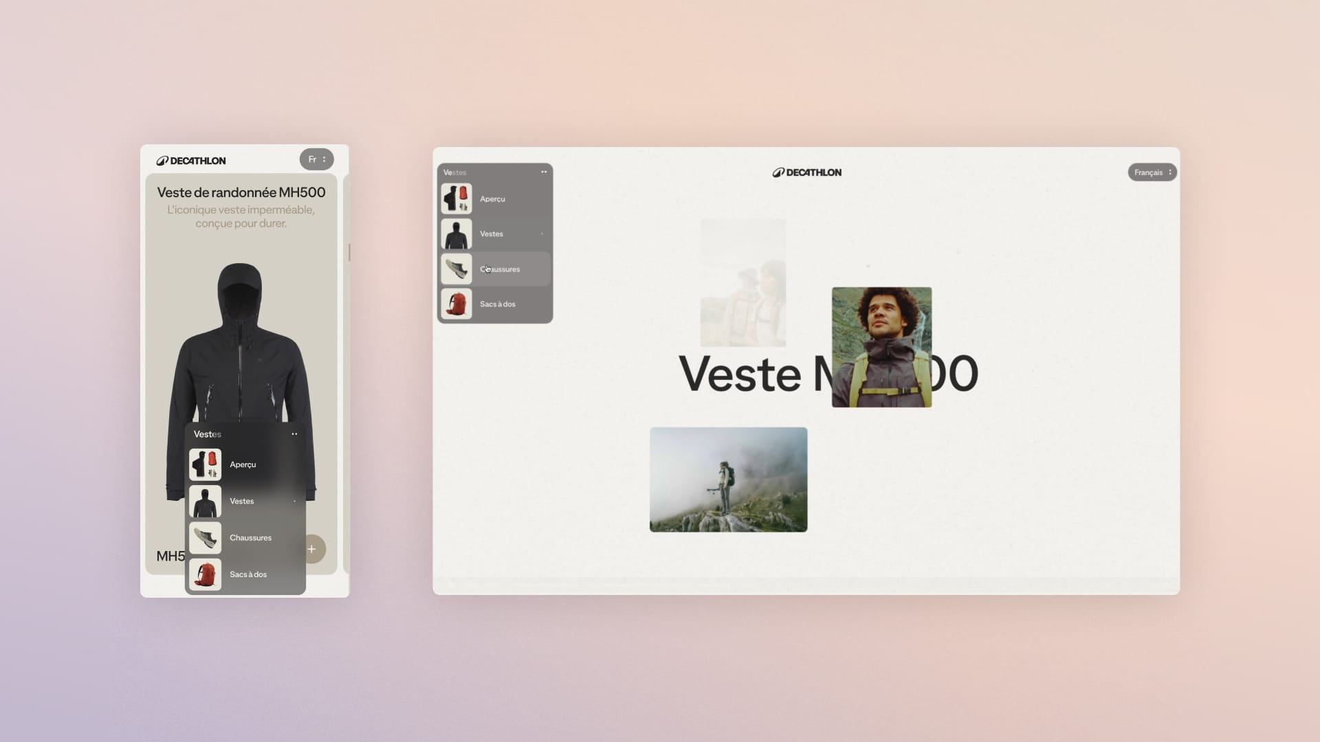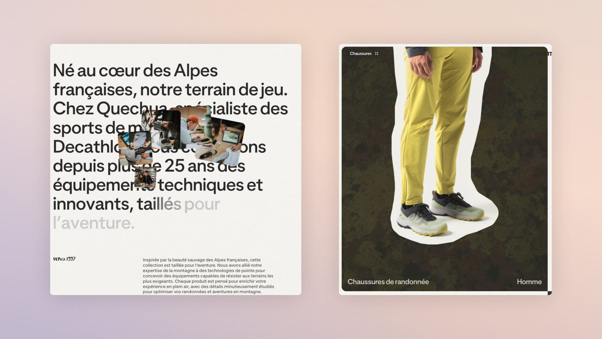 Quechua alterne visuels en situation, qui nourrissent l'aspiration, et preuves de qualité par des détails techniques et concrets.