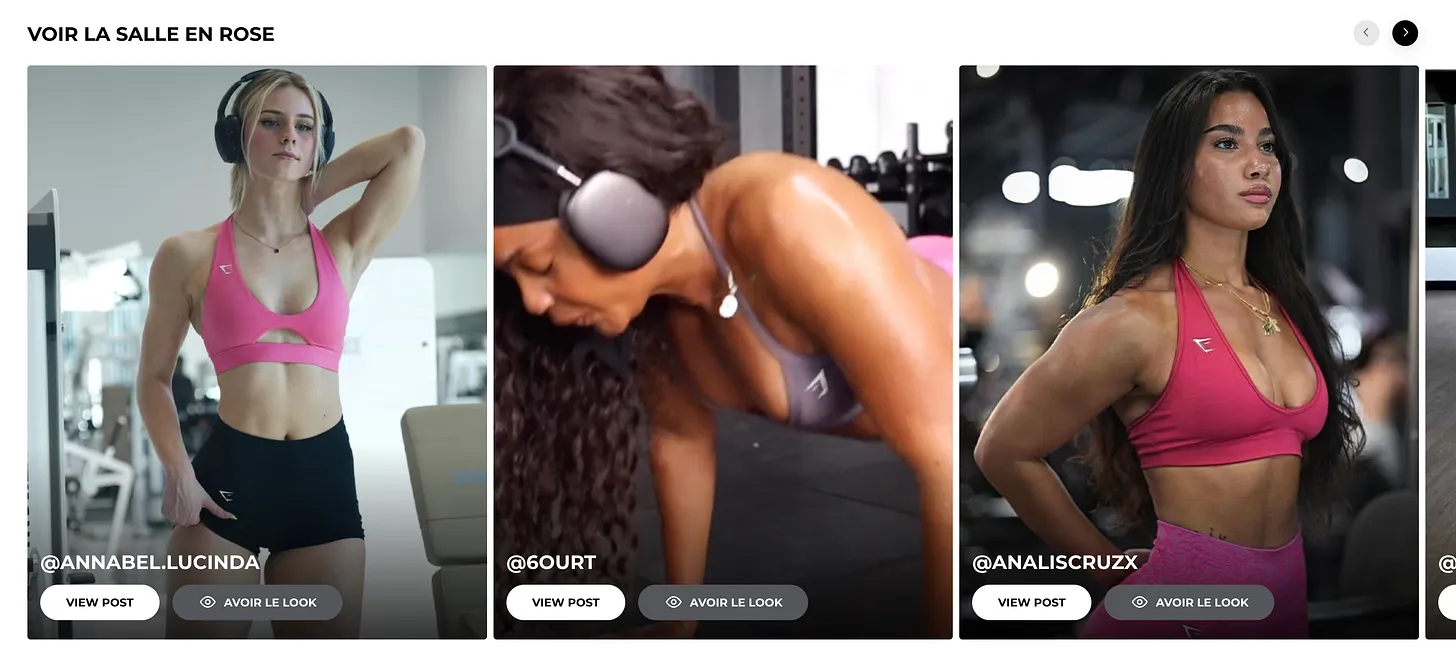 Cette stratégie s'aligne sur les meilleures pratiques de marketing de contenu et cela paie : 70 % des consommateurs préfèrent en savoir plus sur les produits via le contenu plutôt que par la publicité traditionnelle. Les fonctionnalités d'intégration de contenu sur le site Web de Gymshark proposent entres autres :